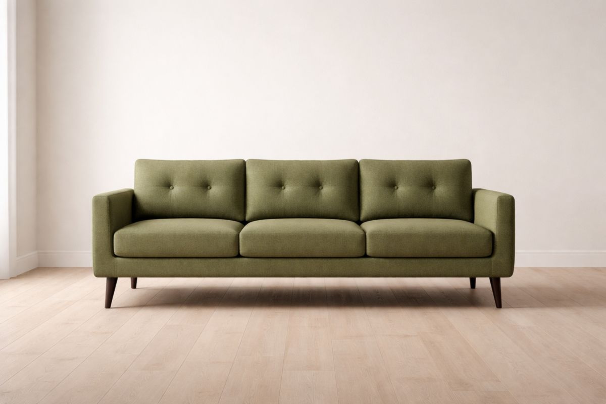 Canapé 3 Places Tissu Vert Pieds en Bois Massif avec coussins