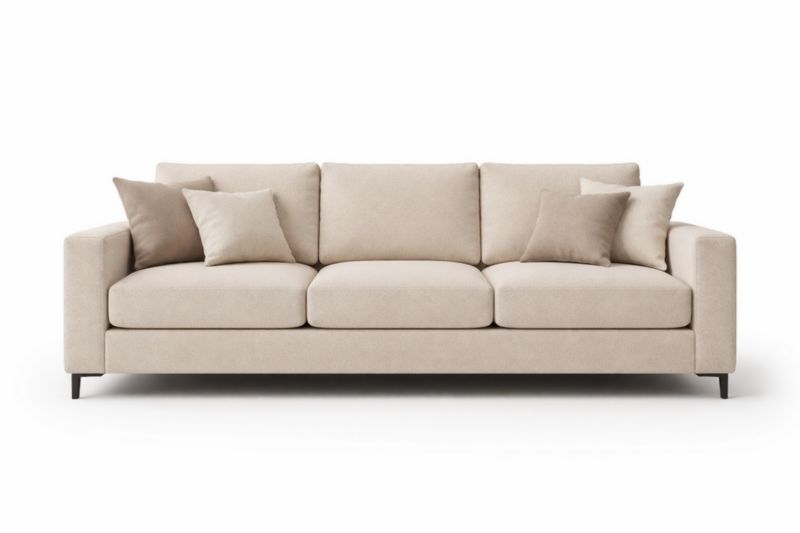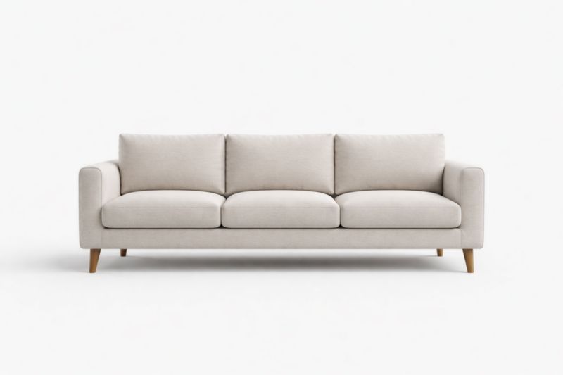 Canapé 3 places tissu Beige structure bois massif pieds aluminium avec coussins