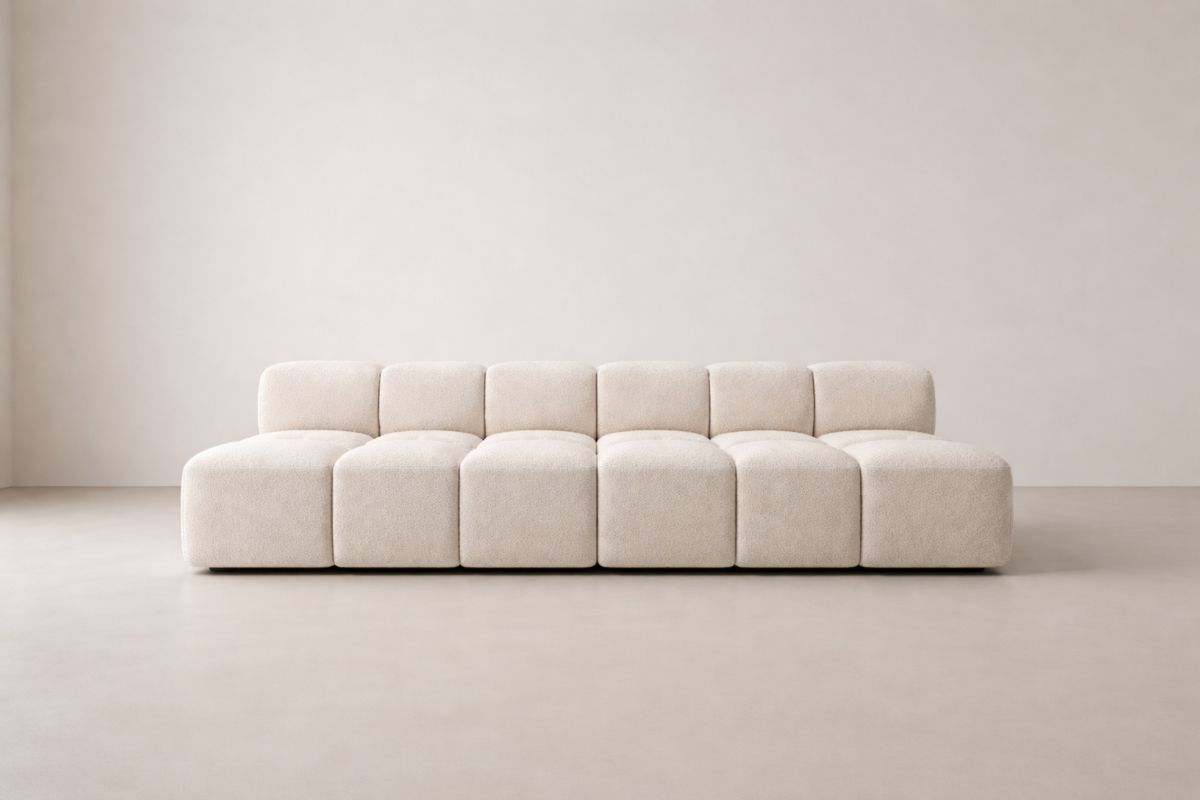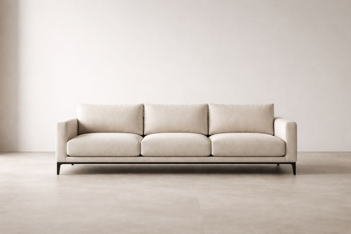 Canapé 3 places en tissu beige avec structure en aluminium, coussins